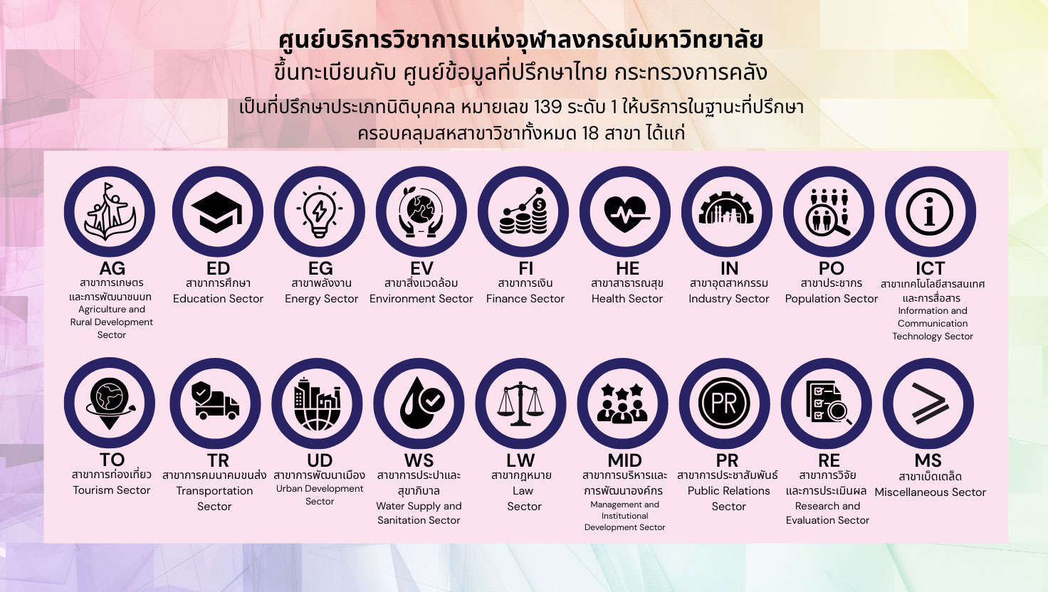 ปัจจุบัน ศูนย์บริการวิชาการแห่งจุฬาลงกรณ์มหาวิทยาลัย ให้บริการที่ปรึกษาใน 18 สาขา ได้แก่ สาขาการเกษตรและพัฒนาชนบท สาขาการศึกษา สาขาพลังงาน สาขาสิ่งแวดล้อม สาขาการเงิน สาขาสาธารณสุข สาขาอุตสาหกรรม สาขาประชากร สาขาเทคโนโลยีสารสนเทศและการสื่อสาร สาขาการท่องเที่ยว สาขาการคมนาคมขนส่ง สาขาพัฒนาเมือง สาขาการประปาและสุขาภิบาล สาขากฎหมาย สาขาการบริหารและพัฒนาองค์กร สาขาการประชาสัมพันธ์ สาขาการวิจัยและประเมินผล และสาขาเบ็ดเตล็ด